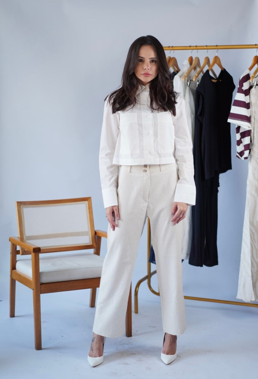 A Calça Areia é aquele tipo de peça que nunca sai de moda. Composta por viscose e linho, ela é sinônimo de conforto, beleza e versatilidade — aquele básico chique que vai com tudo.